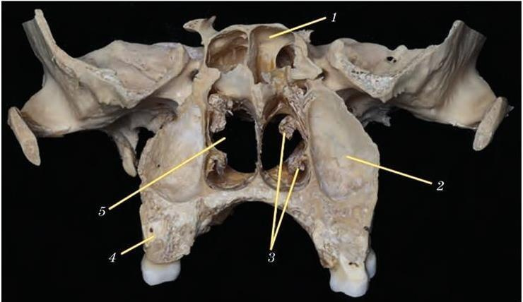1 клиновидная пазуха; 2 верхнечелюстная пазуха; 3 средняя и нижняя носовые раковины; 4 верхняя челюсть (альвеолярный отросток); 5 полость носа
