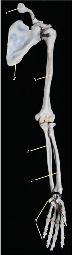1 ключица; 2 лопатка; 3 плечевая кость; 4 локтевая кость; 5 лучевая кость; 6 кости кисти