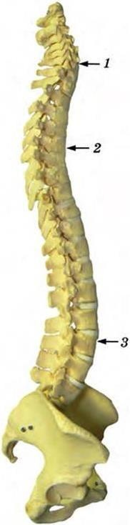 1 шейный лордоз (изгиб кпереди); 2 грудной кифоз (изгиб кзади); 3 поясничный лордоз