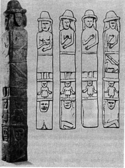 Резные изображения характеризуют собой славянскую модель мироздания, состоящую из трех ярусов. Верхний ярус царство небесное. Здесь представлены два бога: Дажьбог божество солнечного света, податель благ, мифический родоначальник русских людей; Перун бог грозы и молнии, покровитель воинов. Средний ярус земное царство. В нем властвуют две богини-рожаницы: Мокошь «мать урожая», богиня земли, хозяйка символического рога изобилия; Лада вторая рожаница, покровительница весенней вегетативной силы и семейных браков. Здесь же изображены и люди хоровод мужчин, женщин и детей. Нижний ярус подземное царство. Его представляет символическое изображение Волоса (Велеса) доброжелательного бога земли и скота, который держит на плечах плоскость земного пространства с людьми.
