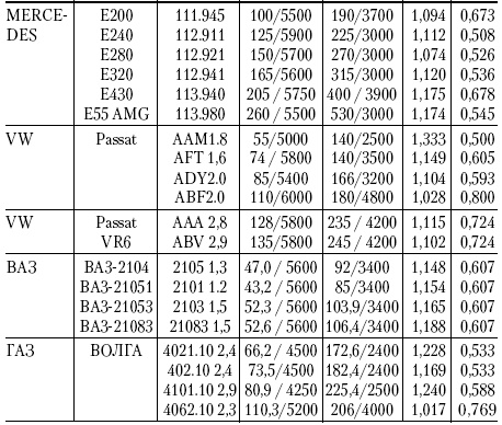 Показатели динамических качеств легковых автомобилей с бензиновыми двигателями