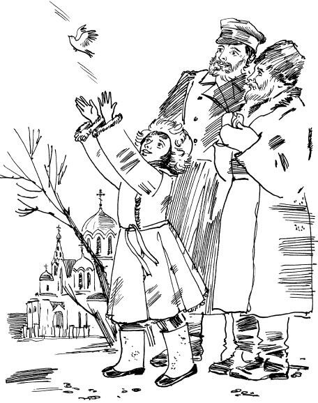 Денис подскакивает, берёт птичку, как камушек, и запускает в небо, совсем необыкновенно. Въезжает наша новая пролётка, вылезают наши и тоже выпускают. Проходит Василь Василия, очень парадный, в сияющих сапогах в калошах, грызёт подсолнушки. Достаёт серебряный гривенник и даёт Солодовкину: