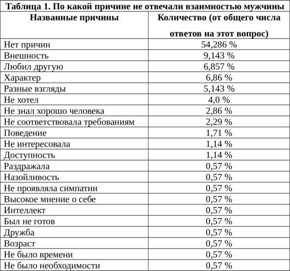 Примерно 54% ответов юношей и 45% ответов девушек показывают, что они сами не могут назвать конкретную причину своей нелюбви (р> 0,005). По результатам нашего исследования, как у юношей, так и у девушек при невзаимной любви бессознательные и сознательные причины встречаются примерно в равном количестве случаев. Главный принцип поведения, который следует из модульной теории незаметное подражание, «отзеркаливание», целью которого является адекватное заполнение модуля объекта любви, то есть уделять человеку столько внимания, сколько он вам.