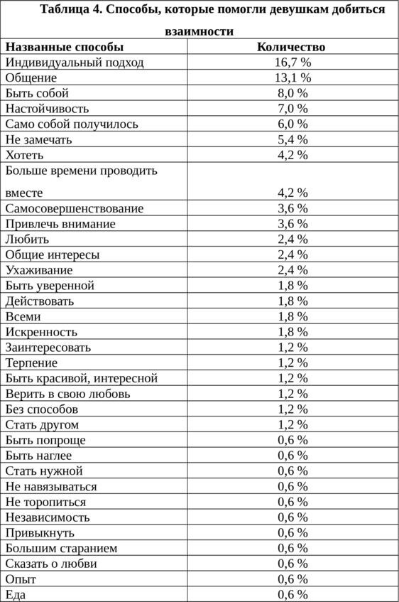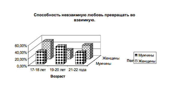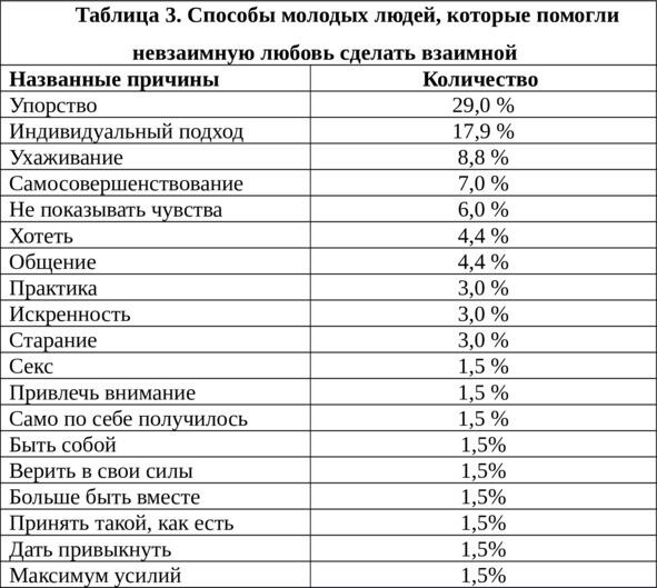 У 45,7% молодых людей и 46,9% девушек получалось превращать невзаимную любовь во взаимную (р> 0,005).