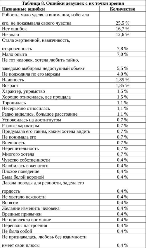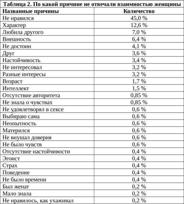 Примерно 54% ответов юношей и 45% ответов девушек показывают, что они сами не могут назвать конкретную причину своей нелюбви (р> 0,005). По результатам нашего исследования, как у юношей, так и у девушек при невзаимной любви бессознательные и сознательные причины встречаются примерно в равном количестве случаев.
