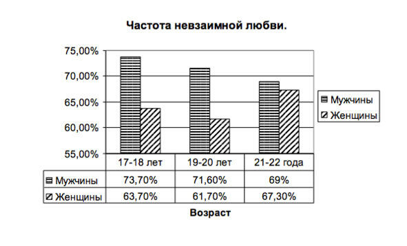 У мужчин в первой группе невзаимная любовь была в 73,7% случаев, во второй 71,6%, в третьей в 69% случаев.