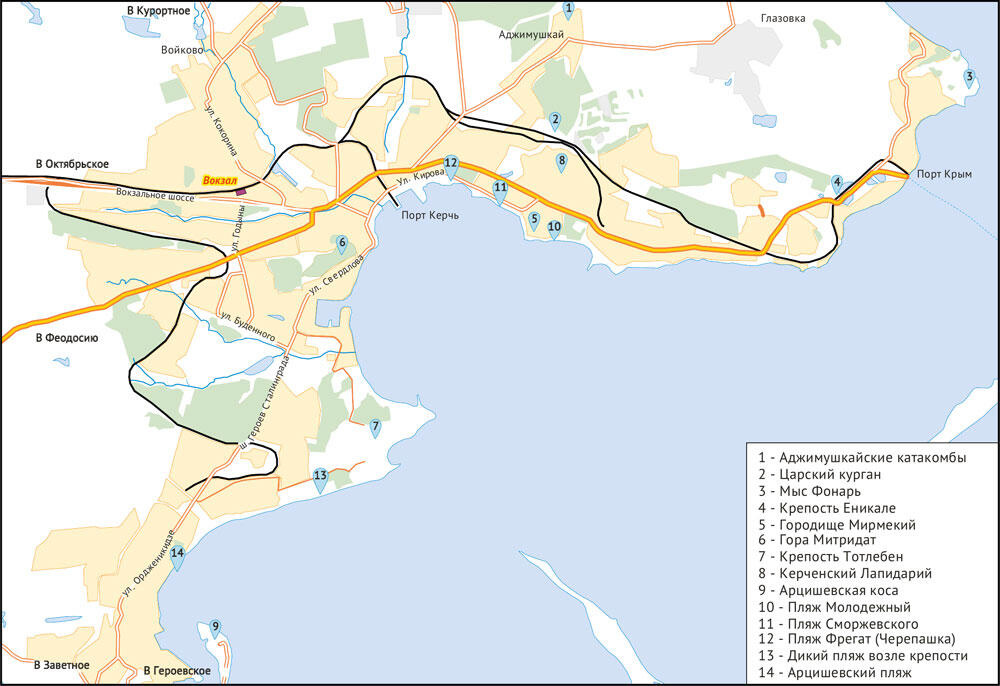На пути к центру города после парка имени Войкова вы можете свернуть налево и подъехать к Карантинному мысу, чтобы увидеть древнее городище Мир-мекий. Город был основан во второй половине VI века до н. э. ионийскими греками. Население жило в небольших землянках. Впоследствии вокруг акрополя была построена оборонительная стена. В V веке до н. э. город разросся и был застроен уже более капитальными наземными строениями. Проехав центр города и, выехав на улицу Кирова, вы увидите высокий холм, называемый горой Митридат (6). Возвышенность так названа в честь понтийского царя Митридата IV Евпатора, погибшего в ходе политической и военной борьбы с римлянами. В настоящее время это культурный центр города, содержащий большое число античных памятников, средневековья и Нового времени. Внизу горы находится древний храм Иоана Предтечи, а наверху расположился памятник воинам Великой Отечественной войны. К обелиску славы, расположенному на высоте около 90 метров, ведет Большая Митридатская лестница произведение архитектора Александра Дигби в стиле классицизма. С северной стороны горы располагаются раскопки античного города Пантикапей. Велотуристам советую прокатиться по улицам вокруг этого места, богатого невысокой старинной застройкой. Отсюда начинается широкая городская набережная.