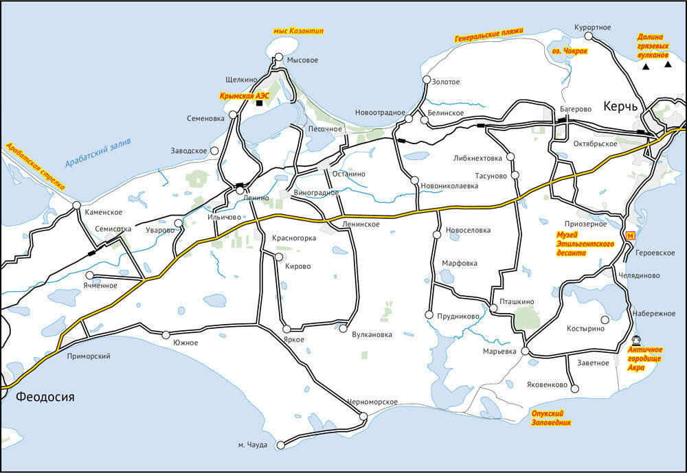 Большей популярностью пользуется северный азовский берег. Для проезда по северному берегу вам нужно выехать из Керчи по улице Вокзальной. Автомобильная дорога идет вдоль железной, затем сворачивает к морю в село Новоотрадное. На данном участке есть грунтовая дорога вдоль берега до самого Казантипа. На ней по большей части пески, но не глубокие. Между поселками Юркино и Курортный под селом Бондаренково на обширной территории расположена долина грязевых вулканов. Самый мощный из них вулкан Андрусова, или, как его ещё называют, сопка Андрусова. Эти вулканы занимают площадь 3 кв. км. Всего их около 50, все они постоянно бурлят, извергая газ и грязь. Не пытайтесь зажечь спичку, метан взрывоопасен! Проехав Курортное, можно посмотреть соленое озеро Чокрак. Его глубина не превышает 1,3 метров. Вода настолько соленая, что белая закристаллизовавшаяся соль видна на поверхности, поэтому на фотографиях оно выглядит белым. Озеро питается целебными сероводородными источниками и морскими водами, а на дне лежит лечебная грязь. Она полезна при лечении заболеваний опорно-двигательного аппарата и гинекологией и урологией, а также связанных с нервной системой. Третьим интересным местом являются Генеральские пляжи, распложенные к западу от озера Чокракского. Такое название они получили благодаря тому, что эта территория в советское время была занята военными, и простому человеку попасть туда было невозможно. На протяжении 26 км береговая линия изрезана обрывистыми уступами, скалами и маленькими бухтами с пляжами, вода в которых летом хорошо прогревается. Здесь можно увидеть причудливые формы выветривания, сделанные солнцем, ветром и водой на протяжении столетий. Это неглубокие гроты и арочные своды. Здесь можно найти тенистую лужайку с запахами трав Кар-латской степи, смешанных с запахом моря. Вдоль берега идут грунтовые дороги, по которым можно добраться до любой точки. Они проходимы лишь для внедорожного автомобиля, мотоцикла или горного велосипеда. Интересным местом для стоянки также является мыс Казантип. Рядом расположено несколько домов отдыха и пляжей. Мыс Казантип является природным заповедником. Он отличается большим многообразием пород: от известняков до глин. Берег в некоторых местах имеет причудливую форму. На этом полуострове с 1992 по 1999 годы устраивались международные фестивали электронной музыки «Республика КаZантип». В 20072008 годах на нем проходили съемки фильма «Обитаемый остров» Федора Бондарчука. Рядом с ним расположен небольшой город Щелкино, являющийся популярным местом отдыха.