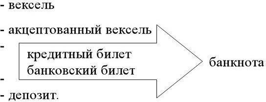 Итак, в обращении появляются кредитные деньги. По форме существования они делятся на документарные деньги (наличные) и бездокументарные (безналичные), по способу перемещения на хартальные и жиральные (переводные), по обратимости на обратимые банкноты или разменные и необратимые. Обратимые кредитные деньги могут конвертироваться: в монеты из эталонного металла (при золотомонетном стандарте); в слитки при золотослитковом стандарте; в валюту, разменную на золото при золотодевизном стандарте; в неразменную валюту при многовалютном стандарте (при нем обратимость на золото трансформировалась в обратимость на иностранную валюту); из нотальных денег в жиральные и наоборот. С точки зрения эволюции виды кредитных денег можно ранжировать следующим образом: