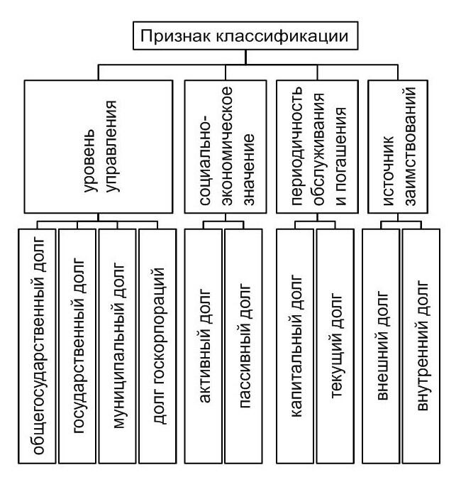 Различают следующие основные виды государственного долга в зависимости от признака, положенного в основу классификации (рисунок 1).