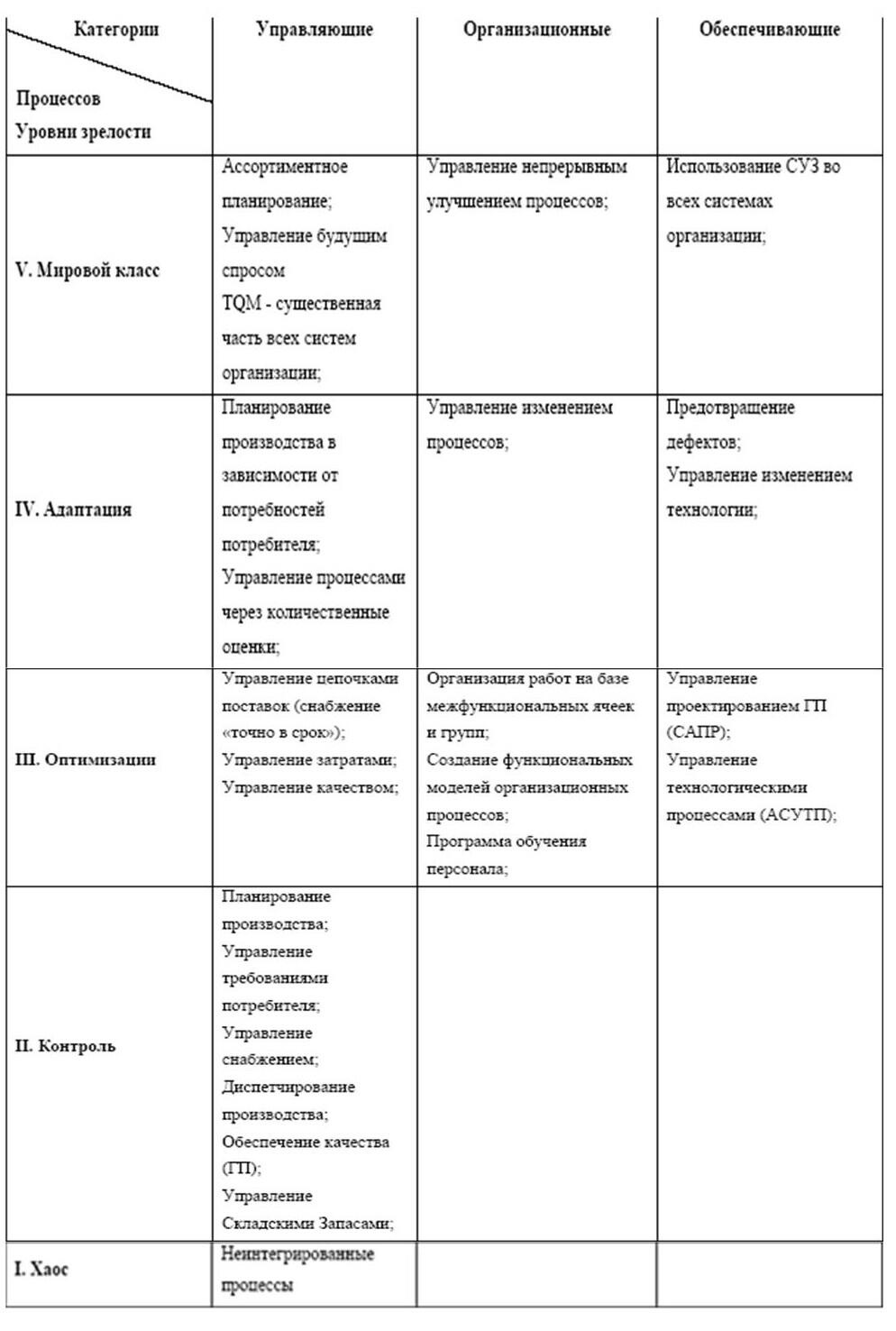 Достижение всех целей в рамках КП для заданного уровня BPI определяет соответствие организации данному уровню. Если хотя бы одна цель хотя бы одной КП для уровня BPI не достигнута, то организация не может соответствовать данному уровню BPI. КП можно разбить на три категории: управляющие, организационные и обеспечивающие (Таблица 1.2.2). BPI не определяет все процессы, имеющие отношение к жизненному циклу продукции; выделяются только те, которые необходимы для достижения уровня BPI, они и включаются в Ключевые Процессы.