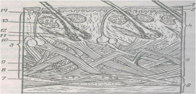 1 роговой слой; 2 ростковый слой; 3 дерма; 4 сосочковый слой; 5 сетчатый слой; 6 подкожная клетчатка; 7 жировые отложения; 8 пучок коллагеновых волокон; 9 поперечный разрез пучка коллагеновых волокон; 10 потовая железа; 11 мускул; 12 волосяная сумка; 13 сальная желе; 14 волос.