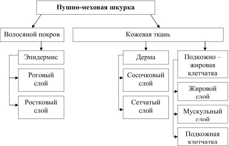 Пушная или меховая шкурка состоит из волосяного покрова и кожевой ткани, которая включает в себя эпидермис, дерму и подкожно-жировую клетчатку (рисунок 4).