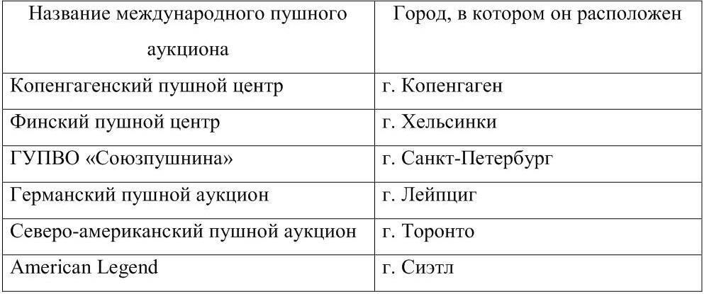 Большие однородные партии пушнины реализуются на международных пушных аукционах, на которые приезжают покупатели со всего мира, предложенные в таблице 1.