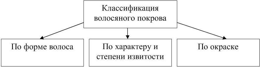 Сердцевина волоса представляет собой рыхлую, пористую ткань, состоящую из многогранных клеток с ороговевшими оболочкой и протоплазмой. Внутри клеток находятся пузырьки воздуха и зерна пигмента. Волосяной покров классифицируется по следующим признакам (рисунок 7), [9, с. 169-172].