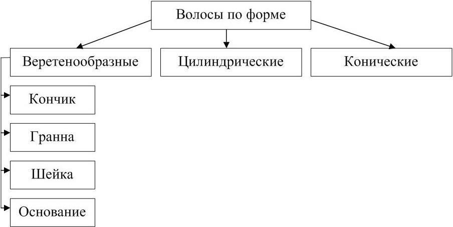 Волосы по форме могут быть трех типов: веретенообразные, цилиндрические и конические. Наиболее часто встречаются веретенообразные волосы, которые состоят из четырех частей: кончика, гранны (наиболее широкой части), шейки и основания. Форма поперечного сечения гранны волоса неодинакова у разных видов зверей: округлая (крот, хомяк), овальная (песец, соболь, куница), плоская (выдра, нутрия), бобовидная (сурок), гантелевидная (кролик) (рисунок 8), (рисунок 9).