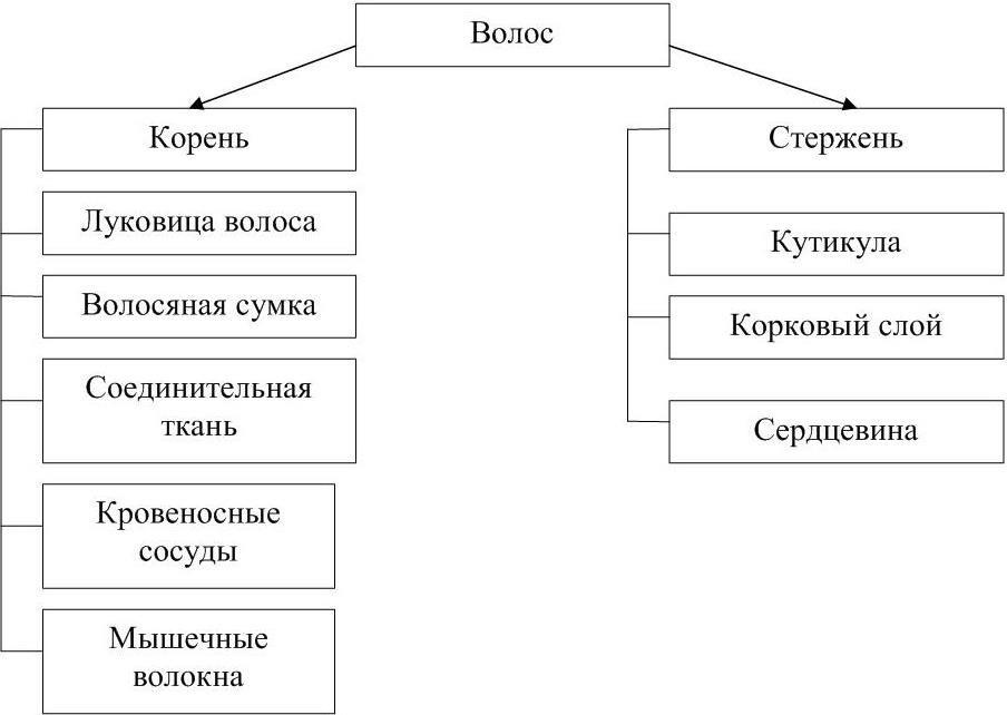 Стержень волоса состоит из трех слоев: кутикулы (наружного чешуйчатого слоя), коркового слоя и сердцевины [5, с. 95-96].