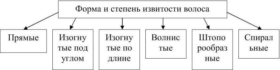 По характеру и степени извитости волосы у пушных зверей бывают различной формы: прямые, изогнутые под углом, изогнутые по длине, волнистые, штопорообразные, спиральные (рисунок 10) [7, с. 135-136].