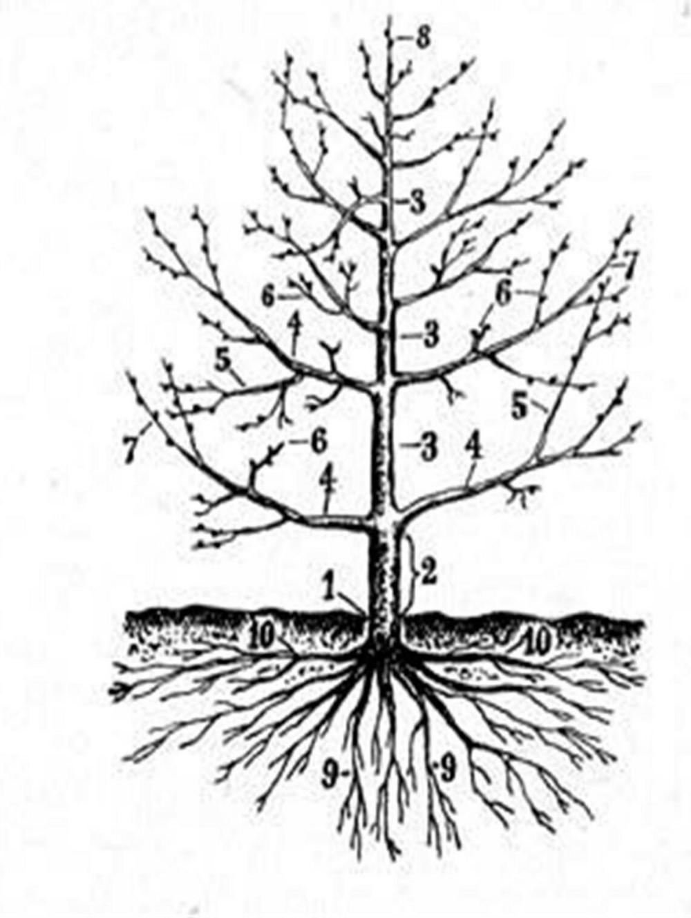 1 корневая шейка, 2 штамб, 3 ствол, 4 основная скелетная ветвь первого порядка, 5 ветви второго порядка, 6 обрастающие веточки, 7 побеги продолжения скелетной ветви, 8 побег продолжения ствола, 9 вертикальные корни, 10 горизонтальные корни