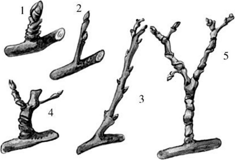 1 кольчатка; 2 копьецо; 3 плодовый прутик; 4 букетная веточка; 5 плодуха