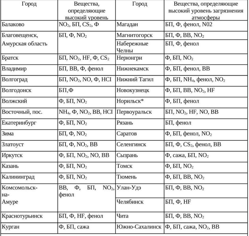 Примечание; Ф формальдегид, ВВ взвешенные вещества, БП бенз(а)пирен, НF-фторид водорода. NО оксид азота, NO2 диоксид азота, СS2 сероуглерод. NH3 аммиак, HCI хлористый водород;