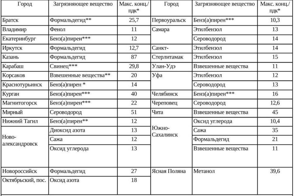Среднемесячные концентрации бенз(а)пирена в атмосфере в 2006 г. превышали 10 ПДК в 7 городах, 5 ПДК в 53 городах с населением более 32 млн. человек.