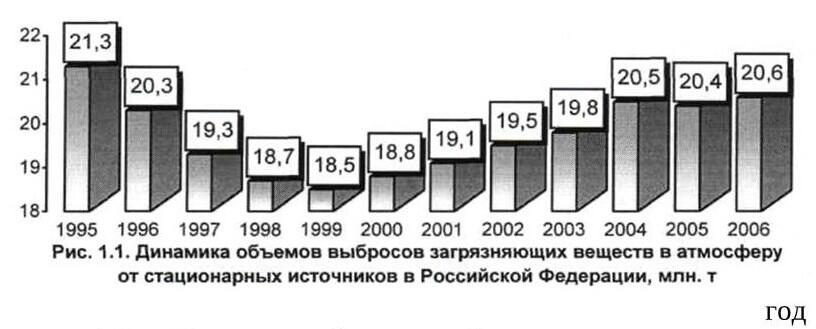Приведенные в таблице 1.4 данные характеризуют выбросы загрязняющих веществ в атмосферный воздух только от стационарных источников. С переходом к рыночной экономике значительно расширилось частное предпринимательство, с открытием мелких цехов увеличилось количество неучтенных выбросов загрязняющих веществ в окружающую среду. Динамика объемов выбросов загрязняющих веществ от стационарных источников за период с 1995 по 2006 гг. показана на рисунке 1.2.