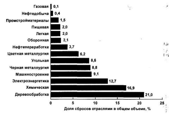 В природную среду с каждым годом во все больших объемах попадают газообразные, жидкие и твердые отходы производств. Различные химические вещества от сгорания, испарения, гниения и разложения, попадая в воздух, почву и воду, переходят по экологическим звеньям из одной цепи в другую и, в конце концов, попадают в организм человека. Распределение отраслей промышленности по производимым сбросам загрязненных сточных вод показано на рисунке 1.4.