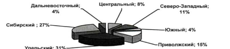 Наибольший вклад в загрязнение атмосферы на территории Российской Федерации вносит Уральский федеральный округ, объем выбросов в котором, составляет 31 % от общего объема выбросов загрязняющих веществ от стационарных источников. На втором месте Сибирский федеральный округ 27 %. Объемы выбросов по округам представлены на рисунке 1.3.