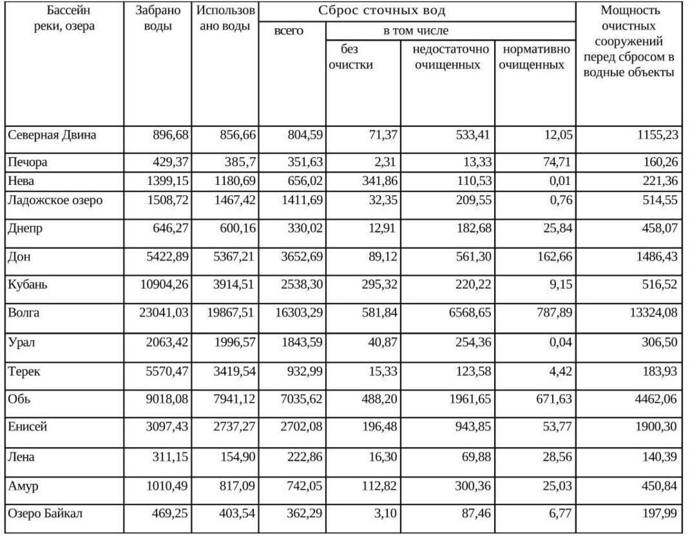 Таблица 1.7 Основные показатели использования воды по речным бассейнам России в 2006 г., млн. м3