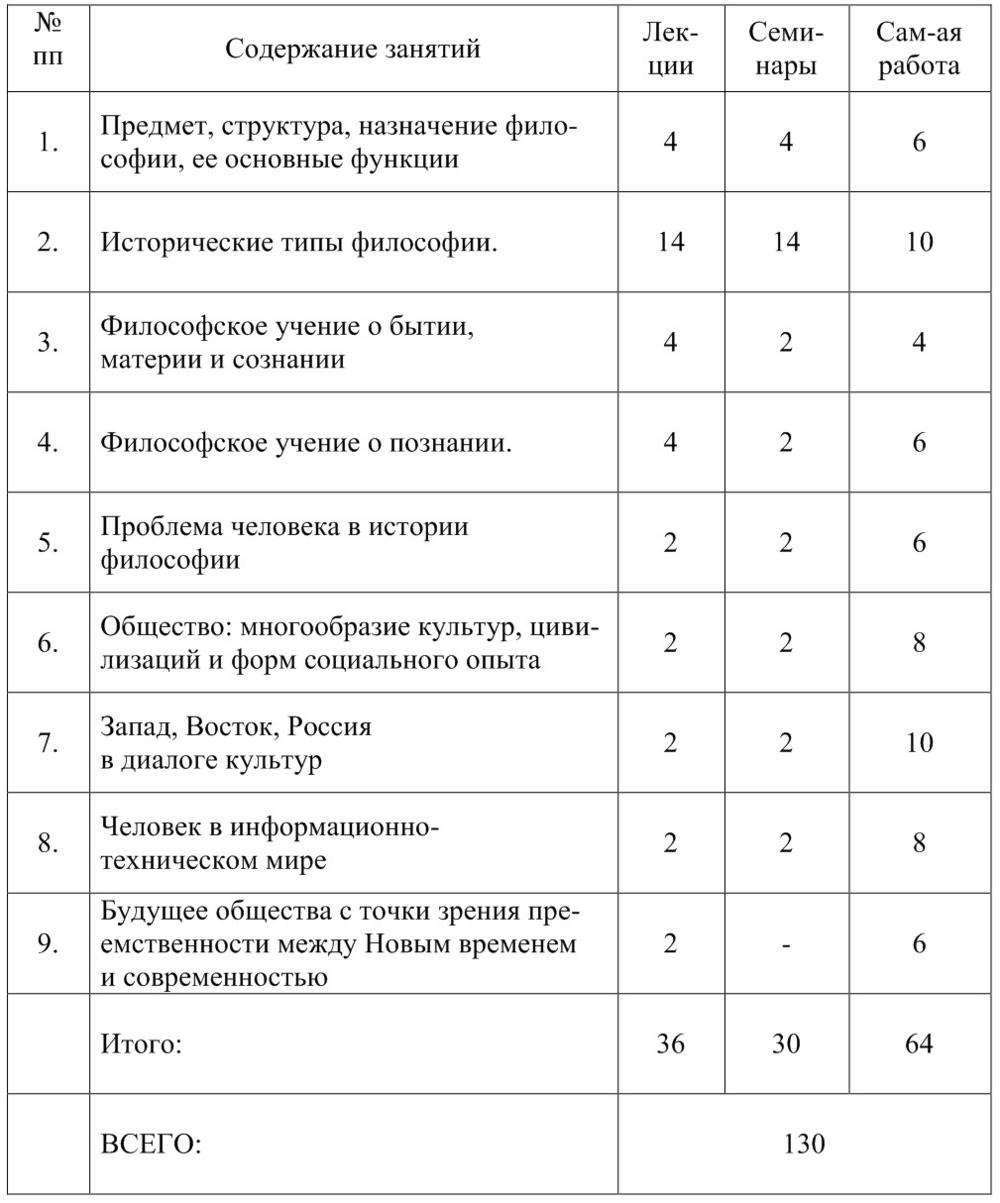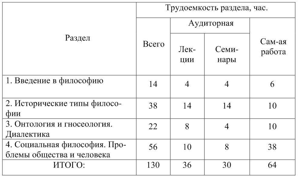 Содержание и структура дисциплиныДисциплина «Философия» состоит из семнадцати лекций, выстроенных в хронологической последовательности, семнадцати семинарских занятий и самостоятельной работы студентов. Дисциплина представлена четырех общих разделах (табл. 1), структурно содержащих в себе девять тем, предусмотренных учебной рабочей программой (Раздел 1 тема 1; Раздел 2 тема 2; Раздел 3 темы 3 4; Раздел 4 темы 5 9).