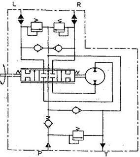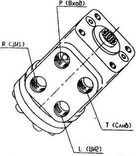 Р нагнетание (вход); R управляющая гидролиния, подача при правом повороте; L управляющая гидролиния, подача при левом повороте; Т слив