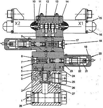 1 корпус; 25 уплотнительные кольца; 6 клапан; 7 втулка; 8 пробка; 9, 11, 28 уплотнительные кольца; 10 пружина; 12 упор; 13 золотник; 14 корпус; 15 гидрораспределитель; 16 электромагнит; 17 прокладка, 18, 20 управляющие предохранительные клапаны; 19 колпак; 21 винт; 22 гайка; 23 пружина; 24 корпус; 25 клапан; 26 гильза; 27 дроссель