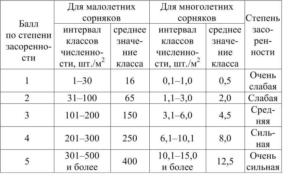 В основу глазомерно-численного метода, разработанного А.М. Туликовым на кафедре земледелия и методики опытного дела ТСХА, положена оценка обилия сорняков по их абсолютной численности на единице площади (таблица 2). Это позволяет определить засоренность в посевах любой культуры и на любой площади. Шкала глазомерной оценки позволяет охватить весь наиболее вероятный диапазон изменения уровня засоренности посевов и использовать математические расчеты для обобщения результатов обследования в целом по всему полю, севообороту.