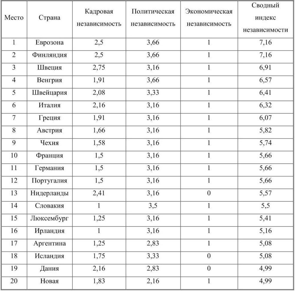 В приведенной таблице указаны сводные индексные оценки независимости по результатам анализа тридцати пяти центральных банков. Ведущие места заняли европейские центральные банки, включая центральный банк еврозоны и Финляндии, а также банки Швеции, Венгрии и Швейцарии. Банк России не попал в первую двадцатку он занял двадцать седьмое место. Соседние места занимают ФРС США и Банк Мексики, которые по общемировым меркам входят в круг относительно зависимых центральных банков.