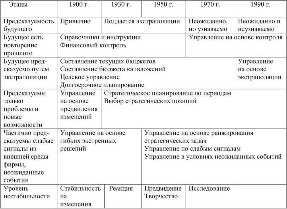 И. Ансофф связывает появление стратегического планирования с необходимостью ориентации фирмы не на существующие условия, а на те, которым еще только предстоит сложиться. Поэтому, чем сложнее и неожиданнее становится будущее, тем больше усложняются управленческие системы. В таблице 1 показана эволюция управленческих систем, которую приводит И. Ансофф.