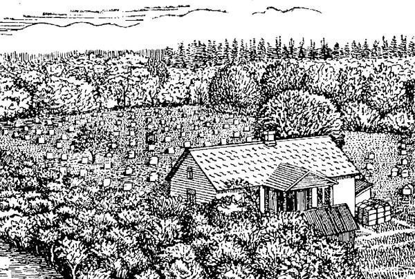 Кустарники и плодовые деревья, посаженные на пасеке, существенно снижают скорость ветра, одновременно служат хорошими ориентирами для пчел и маток, а в полдень затеняют ульи от лучей солнца (рис. 4, 5). В стороне от пасечной площадки размещают производственные (подсобные) постройки.
