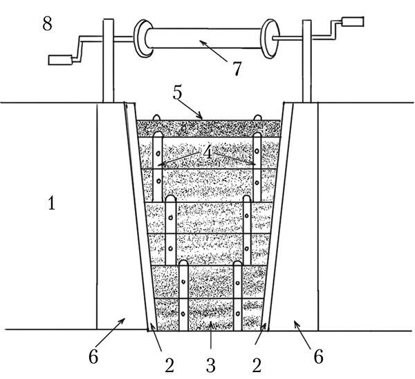Щитовой водослив в водоемах с эффективным ручьевым водоснабжением: 1 дамба; 2 направляющие полозья для подпорных щитов; 3 водоподпорные щиты; 4 металлические пластины с петлями для крепления; 5 каркас с сеткой, которая предотвращает выход рыбы; 6 бетонная основа водослива; 7 съемный барабан для поднятия водоподпорных щитов; 8 пруд