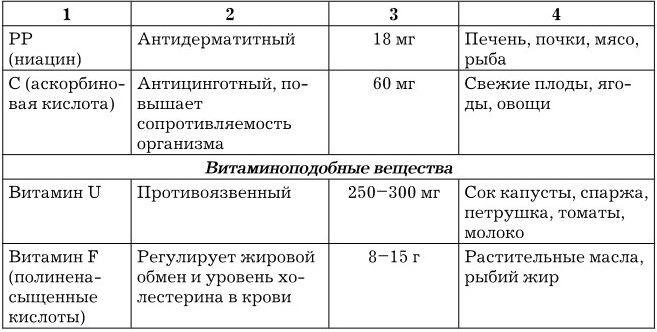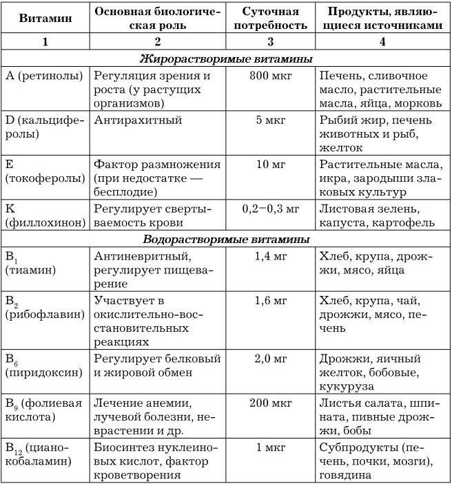 Общая суточная потребность организма в различных витаминах составляет 0,10,2 г. Большинство витаминов не синтезируется человеческим организмом, поэтому они должны поступать вместе с пищей. По растворимости витамины классифицируют на две группы: жирорастворимые и водорастворимые. Характеристика наиболее важных витаминов и витаминоподобных веществ приведена в табл. 1.3.