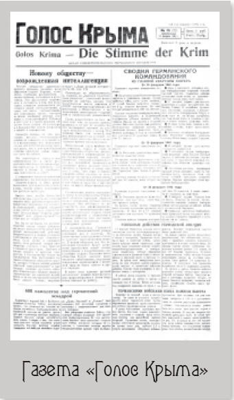 .В 19411944 годах в оккупированном немецко-румынскими войсками Симферополе (население которого, если верить статистике оккупационных властей, на 1 февраля 1942 года составляло 89 691 человек4) Городским управлением массовым тиражом (от 3 до 80 тысяч экземпляров) издавалась профашистская газета «Голос Крыма». В общей сложности с 12 декабря 1941 года по 9 апреля 1944 года вышло 338 номеров. Поначалу газета выходила два раза в неделю на двух полосах, но в основном три раза в неделю на четырех полосах. Ответственным редактором первого номера газеты был М.П.Поливанов, затем ее главными редакторами последовательно состояли В.В.Попов (декабрь 1941 март 1942), А.И.Булдеев (март 1942 октябрь 1943), К.А.Быкович (октябрь 1943 апрель 1944).