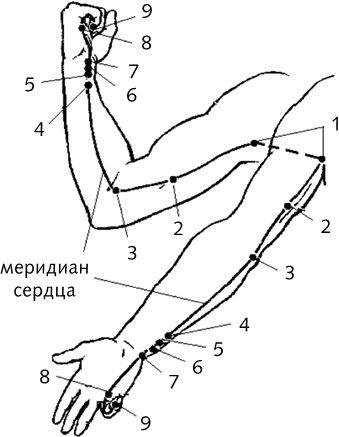 На каждом симметричном меридиане есть 9 наружных точек. Надавливание проводится сверху-вниз, поскольку ручной меридиан сердца центробежный. Энергия идет от сердца к пальцам.