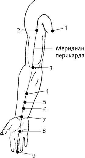 Главные точки меридиана: возбуждающая точка 9. Чжун-чун, успокаивающая точка 9. Чжун-чун, противоболевые точки 9. Чжун-чун.
