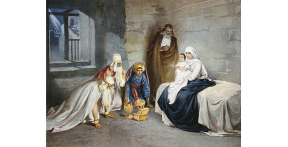 Мф.2:1011 Увидев же звезду, они возрадовались радостью весьма великою, и, войдя в дом, увидели Младенца с Мариею, Матерью Его, и, пав, поклонились Ему; и, открыв сокровища свои, принесли Ему дары: золото, ладан и смирну.