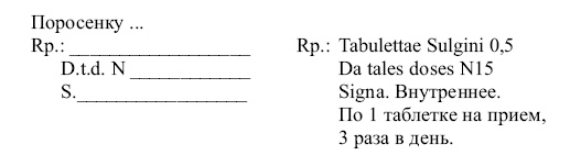 Рецепты по второй схеме прописывают так же, как и по первой выписывается лекарство, не требующее дополнительной обработки, но на несколько приемов в раздельном виде (на предполагаемый курс лечения). В материальной части указывается наименование лекарства и однократная доза; а в subscriptio дается указание об отпуске определенного количества доз (D.t.d. N). По данной схеме чаще всего выписывают официнальные порошки, таблетки, растворы, отдельные лекарственные вещества.