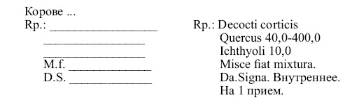 По первой схеме выписывается одна официнальная или магистральная лекарственная форма, один официнальный препарат или одно лекарственное вещество, не требующее дополнительной обработки. Чаще всего по этой схеме выписывают порошок, мазь, раствор, настойку, эмульсию, настой, отвар. В материальной части указывается наименование официальной лекарственной формы, лекарственного вещества и его количество. При прописывании мазей и растворов указывается концентрация и общее количество, а настоев и отваров количество растительного материала и сколько требуется из него изготовить настоя или отвара.
