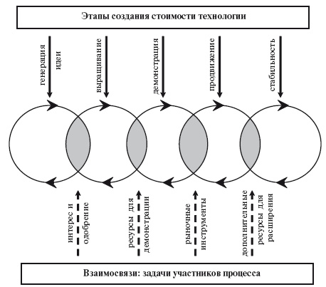 Как видно из рисунка, на пути новой технологии от ее первичной генерации к успеху на рынке находятся пять этапов, или стадий. Очевидно, что каждая стадия по-своему важна. Стоит выделить из цепочки любое звено и она разрушится. По аналогии с этой цепочкой рассмотрим последовательность приращения стоимости в процессах коммерциализации (рис. 1.2).