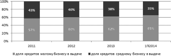 В I полугодии 2014 г. темпы прироста кредитования малого и среднего бизнеса сократились более чем вдвое по сравнению с I полугодием 2013 г. Совокупный портфель банковских кредитов МСП вырос на 3,7 % (8,4 % за аналогичный период прошлого года) до 5,4 трлн рос. руб. (рис. 2.1).