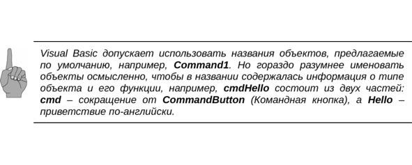 Свойство Caption (Заголовок) есть только у тех объектов, которые могут иметь надпись, видимую на экране монитора, например, у объектов Form (Форма), CommandButton (Командная кнопка) или Frame (Рамка). У нашей формы надпись Привет, мир! можно сейчас увидеть в строке заголовка, где она, также, будет видна в момент выполнения приложения.