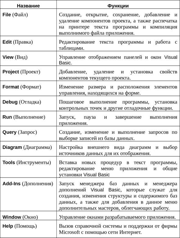 Строка меню (Menu Bar) предоставляет программисту возможность пользования мощным арсеналом функций среды программирования Visual Basic (Рис.2.5).