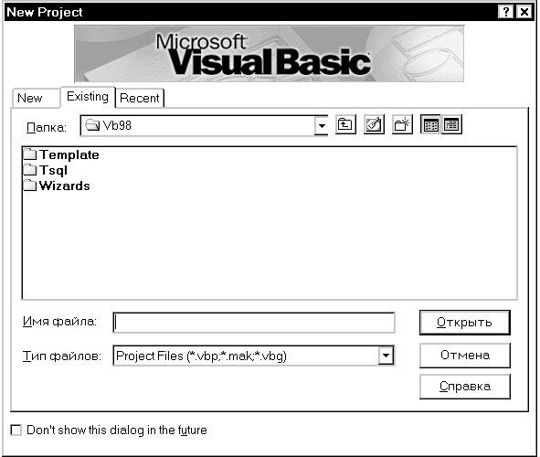 Здесь можно быстро вернуться к одному из последних редактируемых проектов Visual Basic, для чего достаточно выделить щелчком мыши имя файла проекта и нажать кнопку Открыть (Open).